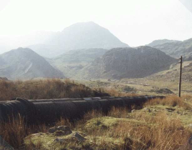 Note View of the Snowdon pipeline halfway up and looking toward the Llydaw ridge and Snowdon. Taken by Gold C's 1981 expedition as they approached their second camp at Llydaw.