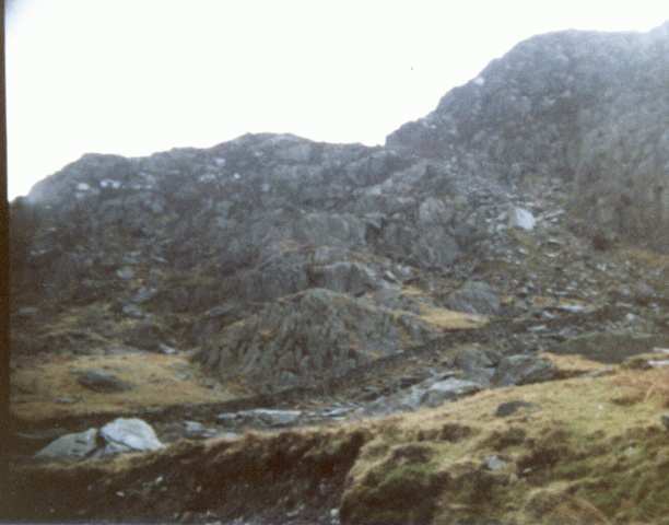Internal Key 1982J001 Title Tryfan from above (The Wall) Picture Type PLACE Key Ref Tryfan above Ogwen Place The Wall check point at Tryfan Date Apr 1982 Taken by David Goddard