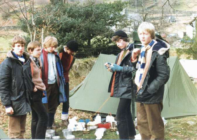 Note Silver E 1983 at one of their expedition camp sites. Left to Right :- Michael Sargent, Christopher Masters, Mark Thurgood, Kevin Vigar, Stephen Tiller and Steven Waller.